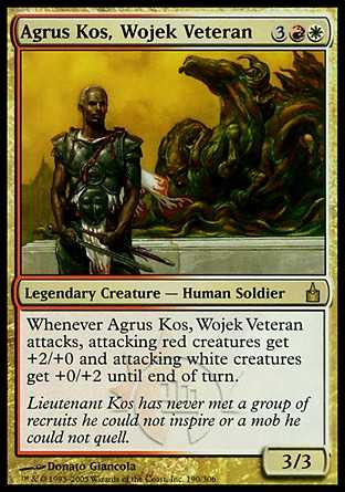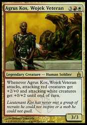 | Card Text | Whenever Agrus Kos, Wojek Veteran attacks, attacking red creatures get +2/+0 and attacking white creatures get +0/+2 until end of turn. |