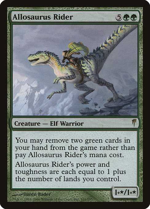 | Card Text | You may exile two green cards from your hand rather than pay Allosaurus Rider"s mana cost. Allosaurus Rider"s power and toughness are each equal to 1 plus the number of lands you control. |