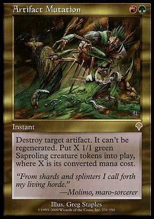 | Card Text | Destroy target artifact. It can"t be regenerated. Put X 1/1 green Saproling creature tokens onto the battlefield, where X is that artifact"s converted mana cost. |