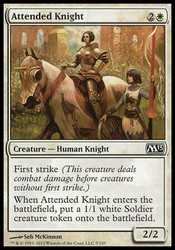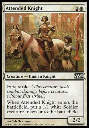 When Attended Knight enters the battlefield, put a 1/1 white Soldier creature token onto the battlefield.