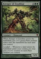 | Card Text | When Avenger of Zendikar enters the battlefield, put a 0/1 green Plant creature token onto the battlefield for each land you control. Landfall - Whenever a land enters the battlefield under your control, you may put a +1/+1 counter on each Plant creature you control. |