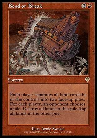 | Card Text | Each player separates all nontoken lands he or she controls into two piles. For each player, one of his or her piles is chosen by one of his or her opponents of his or her choice. Destroy all lands in the chosen piles. Tap all lands in the other piles. |
