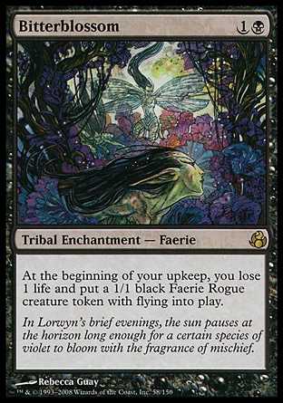Card TextAt the beginning of your upkeep, you lose 1 life and put a 1/1 black Faerie Rogue creature token with flying onto the battlefield.