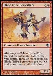 | Card Text | Metalcraft - When Blade-Tribe Berserkers enters the battlefield, if you control three or more artifacts, Blade-Tribe Berserkers gets +3/+3 and gains haste until end of turn. |