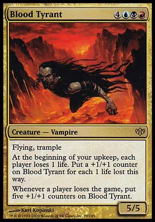 | Card Text | Flying, trample At the beginning of your upkeep, each player loses 1 life. Put a +1/+1 counter on Blood Tyrant for each 1 life lost this way. Whenever a player loses the game, put five +1/+1 counters on Blood Tyrant. |