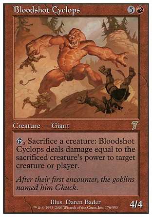 Card Text, Sacrifice a creature: Bloodshot Cyclops deals damage equal to the sacrificed creature"s power to target creature or player.