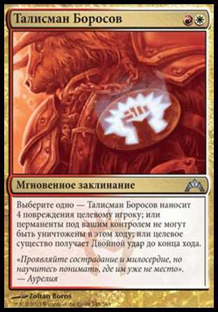 | Card Text | Choose one - • Boros Charm deals 4 damage to target player. • Permanents you control gain indestructible until end of turn. • Target creature gains double strike until end of turn. |