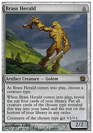 | Card Text | As Brass Herald enters the battlefield, choose a creature type. When Brass Herald enters the battlefield, reveal the top four cards of your library. Put all creature cards of the chosen type revealed this way into your hand and the rest on the bottom of your library in any order. Creatures of the chosen type get +1/+1. |