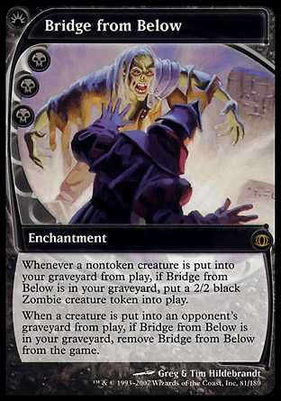 Card TextWhenever a nontoken creature is put into your graveyard from the battlefield, if Bridge from Below is in your graveyard, put a 2/2 black Zombie creature token onto the battlefield.