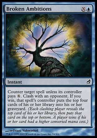 | Card Text | Counter target spell unless its controller pays . Clash with an opponent. If you win, that spell"s controller puts the top four cards of his or her library into his or her graveyard. (Each clashing player reveals the top card of his or her library, then puts that card on the top or bottom. A player wins if his or her card had a higher converted mana cost.) |