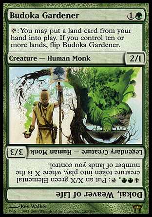 | Card Text | : You may put a land card from your hand onto the battlefield. If you control ten or more lands, flip Budoka Gardener. |