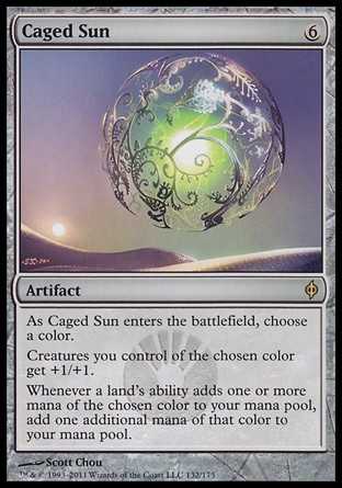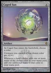 | Card Text | As Caged Sun enters the battlefield, choose a color. Creatures you control of the chosen color get +1/+1. Whenever a land"s ability adds one or more mana of the chosen color to your mana pool, add one additional mana of that color to your mana pool. |