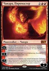| Card Text | +1: Chandra, Pyromaster deals 1 damage to target player and 1 damage to up to one target creature that player controls. That creature can"t block this turn. 0: Exile the top card of your library. You may play it this turn. в€’7: Exile the top ten cards of your library. Choose an instant or sorcery card exiled this way and copy it three times. You may cast the copies without paying their mana costs. |