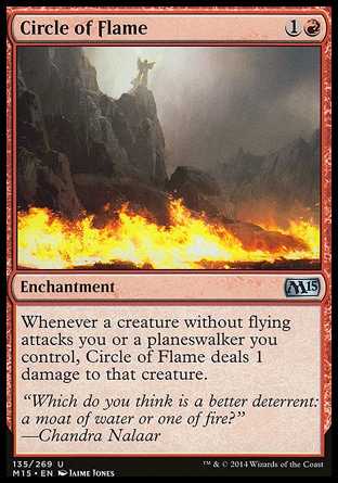 Card TextWhenever a creature without flying attacks you or a planeswalker you control, Circle of Flame deals 1 damage to that creature.