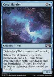 | Card Text | Defender (This creature can"t attack.) When Coral Barrier enters the battlefield, put a 1/1 blue Squid creature token with islandwalk onto the battlefield. (It can"t be blocked as long as defending player controls an Island.) |