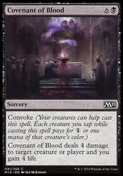 | Card Text | Convoke (Your creatures can help cast this spell. Each creature you tap while casting this spell pays for or one mana of that creature"s color.)Covenant of Blood deals 4 damage to target creature or player and you gain 4 life. |