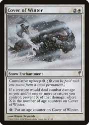 | Card Text | Cumulative upkeep (At the beginning of your upkeep, put an age counter on this permanent, then sacrifice it unless you pay its upkeep cost for each age counter on it. can be paid with one mana from a snow permanent.)If a creature would deal combat damage to you and/or one or more creatures you control, prevent X of that damage, where X is the number of age counters on Cover of Winter.