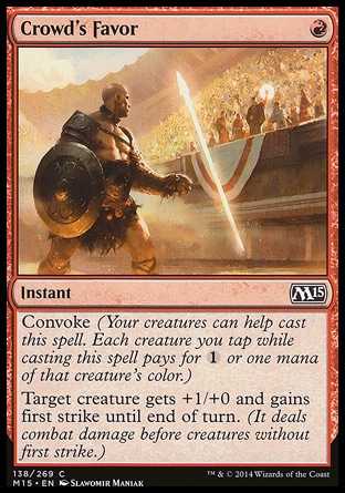 | Card Text | Convoke (Your creatures can help cast this spell. Each creature you tap while casting this spell pays for or one mana of that creature"s color.)Target creature gets +1/+0 and gains first strike until end of turn. (It deals combat damage before creatures without first strike.) |