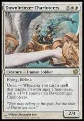 | Card Text | Flying, lifelink Heroic - Whenever you cast a spell that targets Dawnbringer Charioteers, put a +1/+1 counter on Dawnbringer Charioteers. |