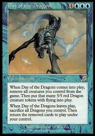 | Card Text | When Day of the Dragons enters the battlefield, exile all creatures you control. Then put that many 5/5 red Dragon creature tokens with flying onto the battlefield. When Day of the Dragons leaves the battlefield, sacrifice all Dragons you control. Then return the exiled cards to the battlefield under your control. |