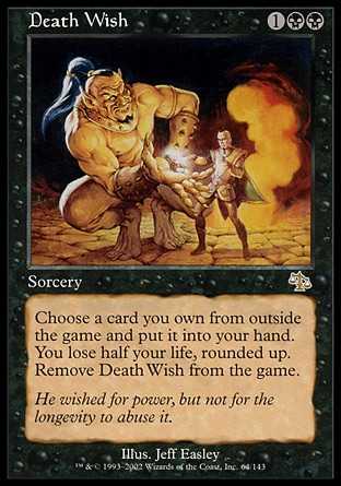 | Card Text | You may choose a card you own from outside the game and put it into your hand. You lose half your life, rounded up. Exile Death Wish. |