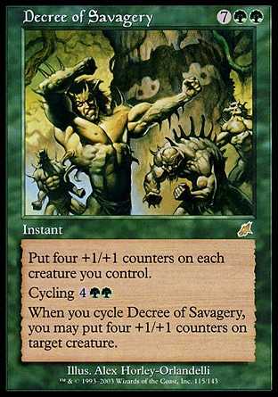 | Card Text | Put four +1/+1 counters on each creature you control. Cycling When you cycle Decree of Savagery, you may put four +1/+1 counters on target creature. |