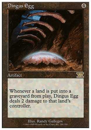 | Card Text | Whenever a land is put into a graveyard from the battlefield, Dingus Egg deals 2 damage to that land"s controller. |