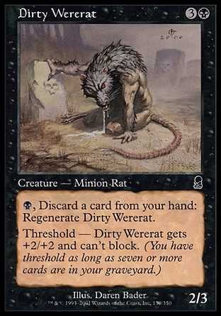 Threshold - As long as seven or more cards are in your graveyard, Dirty Wererat gets +2/+2 and can"t block.
