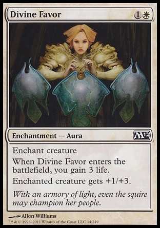 | Card Text | Enchant creature When Divine Favor enters the battlefield, you gain 3 life. Enchanted creature gets +1/+3. |