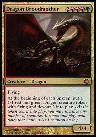 | Card Text | Flying At the beginning of each upkeep, put a 1/1 red and green Dragon creature token with flying and devour 2 onto the battlefield. (As the token enters the battlefield, you may sacrifice any number of creatures. It enters the battlefield with twice that many +1/+1 counters on it.) |