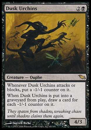 | Card Text | Whenever Dusk Urchins attacks or blocks, put a -1/-1 counter on it. When Dusk Urchins dies, draw a card for each -1/-1 counter on it. |