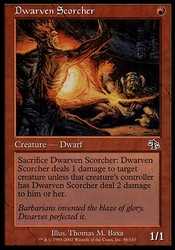 | Card Text | Sacrifice Dwarven Scorcher: Dwarven Scorcher deals 1 damage to target creature unless that creature"s controller has Dwarven Scorcher deal 2 damage to him or her. |