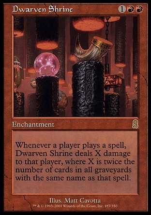 Card TextWhenever a player casts a spell, Dwarven Shrine deals X damage to that player, where X is twice the number of cards in all graveyards with the same name as that spell.