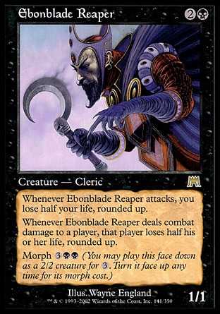 | Card Text | Whenever Ebonblade Reaper attacks, you lose half your life, rounded up. Whenever Ebonblade Reaper deals combat damage to a player, that player loses half his or her life, rounded up. Morph |