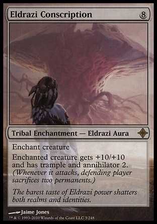 Enchanted creature gets +10/+10 and has trample and annihilator 2. (Whenever it attacks, defending player sacrifices two permanents.)