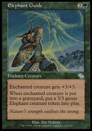 When enchanted creature dies, put a 3/3 green Elephant creature token onto the battlefield.