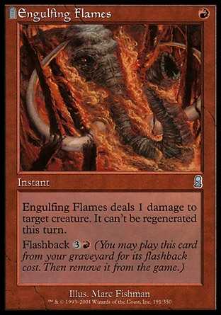 | Card Text | Engulfing Flames deals 1 damage to target creature. It can"t be regenerated this turn. Flashback |