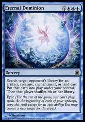 | Card Text | Search target opponent"s library for an artifact, creature, enchantment, or land card. Put that card onto the battlefield under your control. Then that player shuffles his or her library. Epic (For the rest of the game, you can"t cast spells. At the beginning of each of your upkeeps, copy this spell except for its epic ability. You may choose a new target for the copy.) |