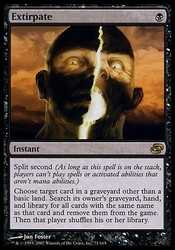 | Card Text | Split second (As long as this spell is on the stack, players can"t cast spells or activate abilities that aren"t mana abilities.) Choose target card in a graveyard other than a basic land card. Search its owner"s graveyard, hand, and library for all cards with the same name as that card and exile them. Then that player shuffles his or her library. |