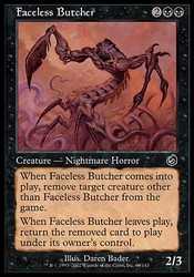 | Card Text | When Faceless Butcher enters the battlefield, exile target creature other than Faceless Butcher. When Faceless Butcher leaves the battlefield, return the exiled card to the battlefield under its owner"s control. |