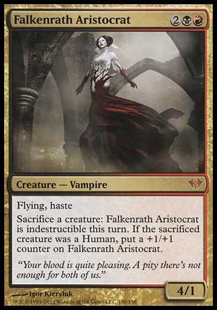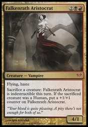 Sacrifice a creature: Falkenrath Aristocrat gains indestructible until end of turn. If the sacrificed creature was a Human, put a +1/+1 counter on Falkenrath Aristocrat.