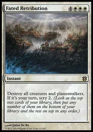 | Card Text | Destroy all creatures and planeswalkers. If it"s your turn, scry 2. (Look at the top two cards of your library, then put any number of them on the bottom of your library and the rest on top in any order.) |