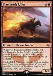 Card TextWhenever Flamerush Rider attacks, put a token onto the battlefield tapped and attacking that"s a copy of another target attacking creature. Exile the token at end of combat.