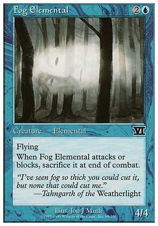 | Card Text | Flying (This creature can"t be blocked except by creatures with flying or reach.) When Fog Elemental attacks or blocks, sacrifice it at end of combat. |