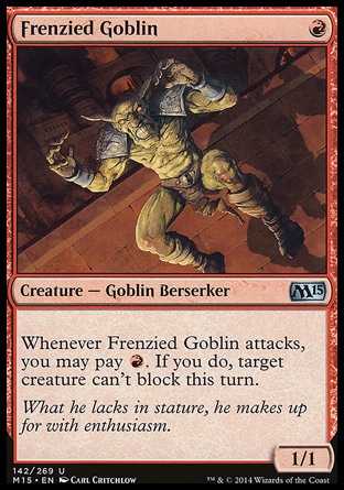 | Card Text | Whenever Frenzied Goblin attacks, you may pay . If you do, target creature can"t block this turn. |