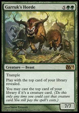 | Card Text | Trample Play with the top card of your library revealed. You may cast the top card of your library if it"s a creature card. (Do this only any time you could cast that creature card. You still pay the spell"s costs.) |