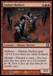 | Card Text | Hellbent - Gathan Raiders gets +2/+2 as long as you have no cards in hand. Morph-Discard a card. (You may cast this card face down as a 2/2 creature for |