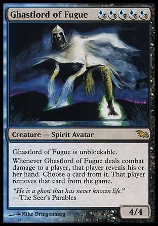 | Card Text | Ghastlord of Fugue can"t be blocked. Whenever Ghastlord of Fugue deals combat damage to a player, that player reveals his or her hand. You choose a card from it. That player exiles that card. |
