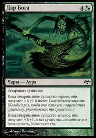 | Card Text | Enchant creature As long as enchanted creature is black, it gets +1/+1 and has deathtouch. (Any amount of damage it deals to a creature is enough to destroy that creature.) As long as enchanted creature is green, it gets +1/+1 and all creatures able to block it do so. |