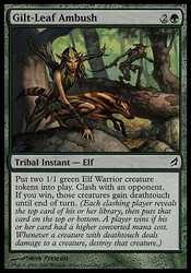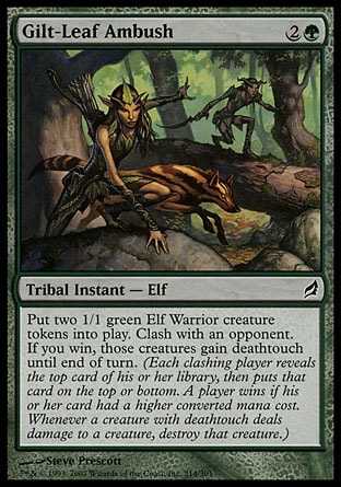| Card Text | Put two 1/1 green Elf Warrior creature tokens onto the battlefield. Clash with an opponent. If you win, those creatures gain deathtouch until end of turn. (Each clashing player reveals the top card of his or her library, then puts that card on the top or bottom. A player wins if his or her card had a higher converted mana cost. Any amount of damage a creature with deathtouch deals to a creature is enough to destroy it.) |